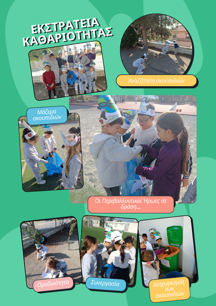 Έγιναν εκστρατείες καθαριότητας αλλά και εκστρατεία μείωσης της πλαστικής μπουκάλας. Οι μαθητές της Α΄ταξης ενθάρρυναν τα παιδιά όλου του σχολείου να χρησιμοποιεί παγουρίνια και οι αλλαγές στους αριθμούς μετά από έρευνα της Ε τάξης έδειξαν τα θετικά απότελέσματα της σχετικής εκστρατείας. Έγιναν αφίσες με τις δράσεις και τοποθετήθηκαν σε διάφορα μέρη του σχολείου για ενημέρωση των μαθητών.