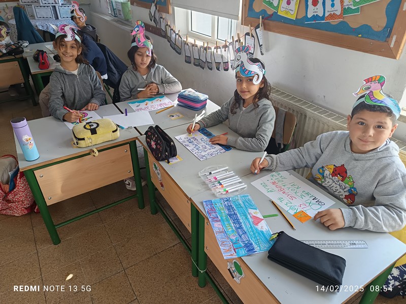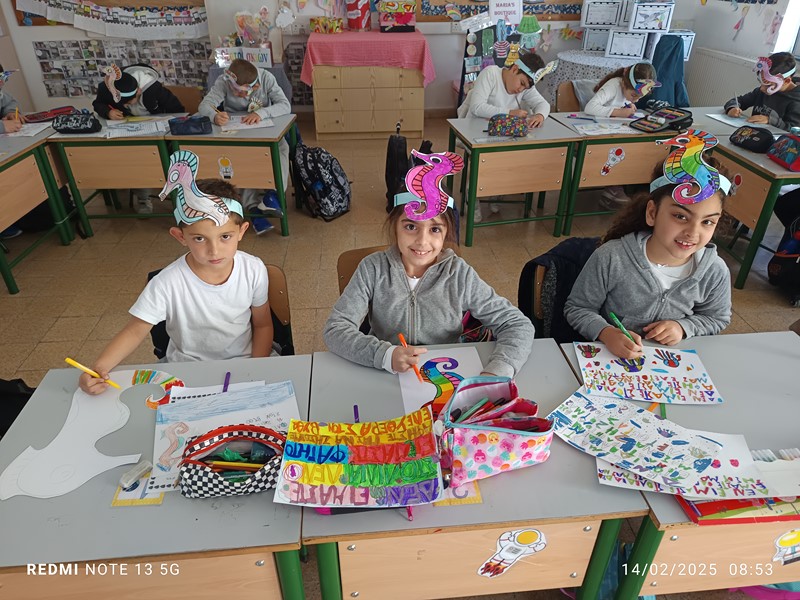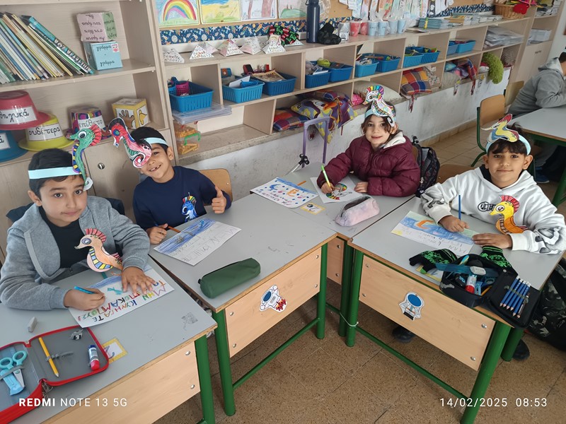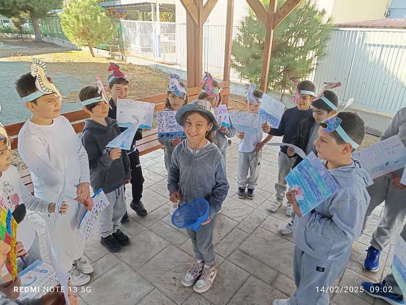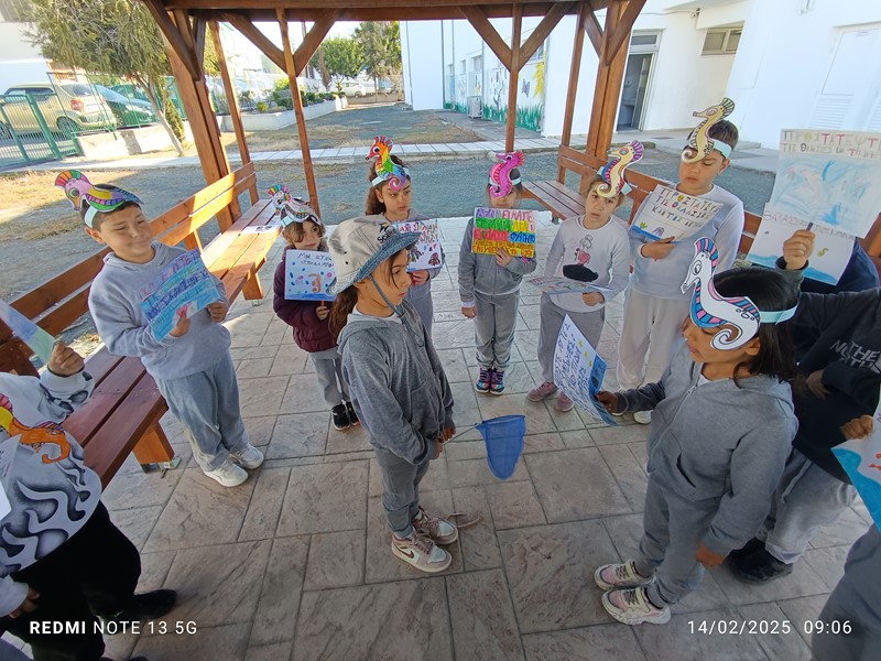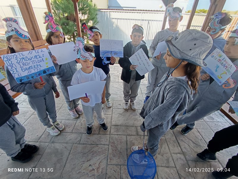 Τα παιδιά της Β’2 μελέτησαν για τη θαλάσσια ρύπανση. Μελέτησαν άρθρα από εφημερίδες και διάβασαν το βιβλίο του Βαγγέλη Ηλιόπουλου: «Ο Τριγωνοψαρούλης, ο Μαυρολέπιας κι ο τελευταίος ιππόκαμπος», εκδόσεις Πατάκη. Εστίασαν στους ιππόκαμπους και το σοβαρό πρόβλημα του κινδύνου εξαφάνισής τους. Έπαιξαν παιχνίδια ρόλων φτιάχνοντας αυτοσχέδιους διαλόγους και αποφάσισαν να ενημερώσουν τα υπόλοιπα παιδιά του σχολείου τους για το κρίσιμο θέμα της εξαφάνισής τους. Έτσι, έφτιαξαν αφίσες και καπέλα και πήγαν από τάξη, σε τάξη.