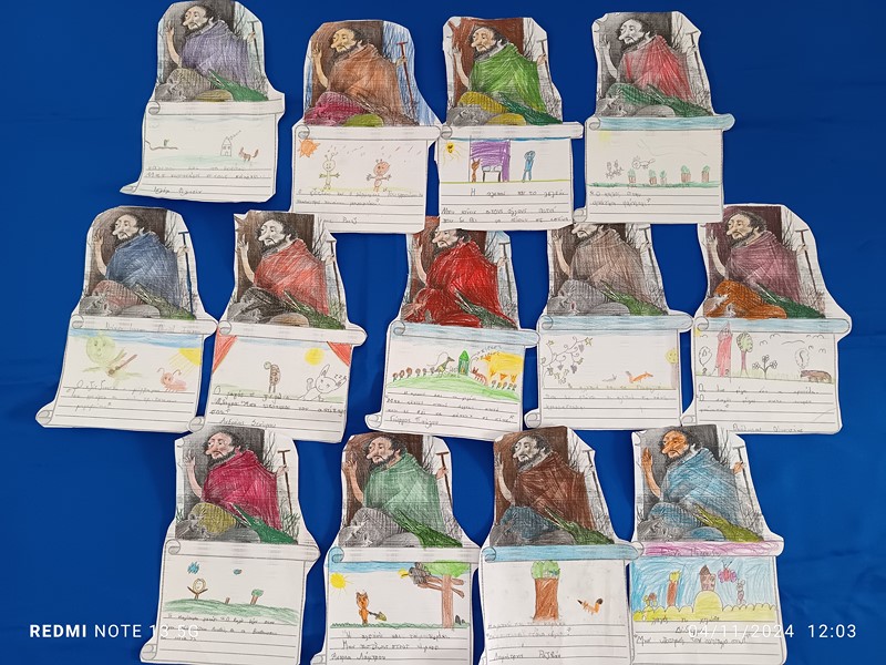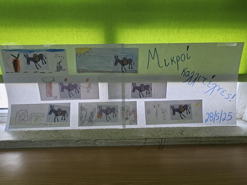 Με αφορμή τον μύθο του Αισώπου «Ο ψεύτης βοσκός», αρχίσαμε να μαθαίνουμε για τον μυθοποιό Αίσωπο. Διαβάσαμε κι άλλους μύθους και τους αναδιηγηθήκαμε είτε γραπτά, χρησιμοποιώντας εργαλεία αφήγησης, είτε προφορικά σαν παραμυθάδες, σαν δημοσιογράφοι, μα και σαν ηθοποιοί δραματοποιώντας διάφορες σκηνές. Το μάθημά μας συνδυάστηκε με την τέχνη, αφού εικονογραφήσαμε με τον δικό μας τρόπο τους αγαπημένους μας μύθους και μεταφέρθηκε και έξω από τη σχολική μας τάξη.